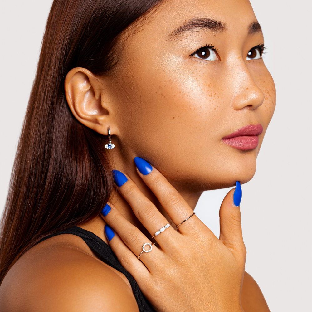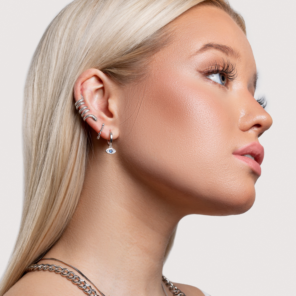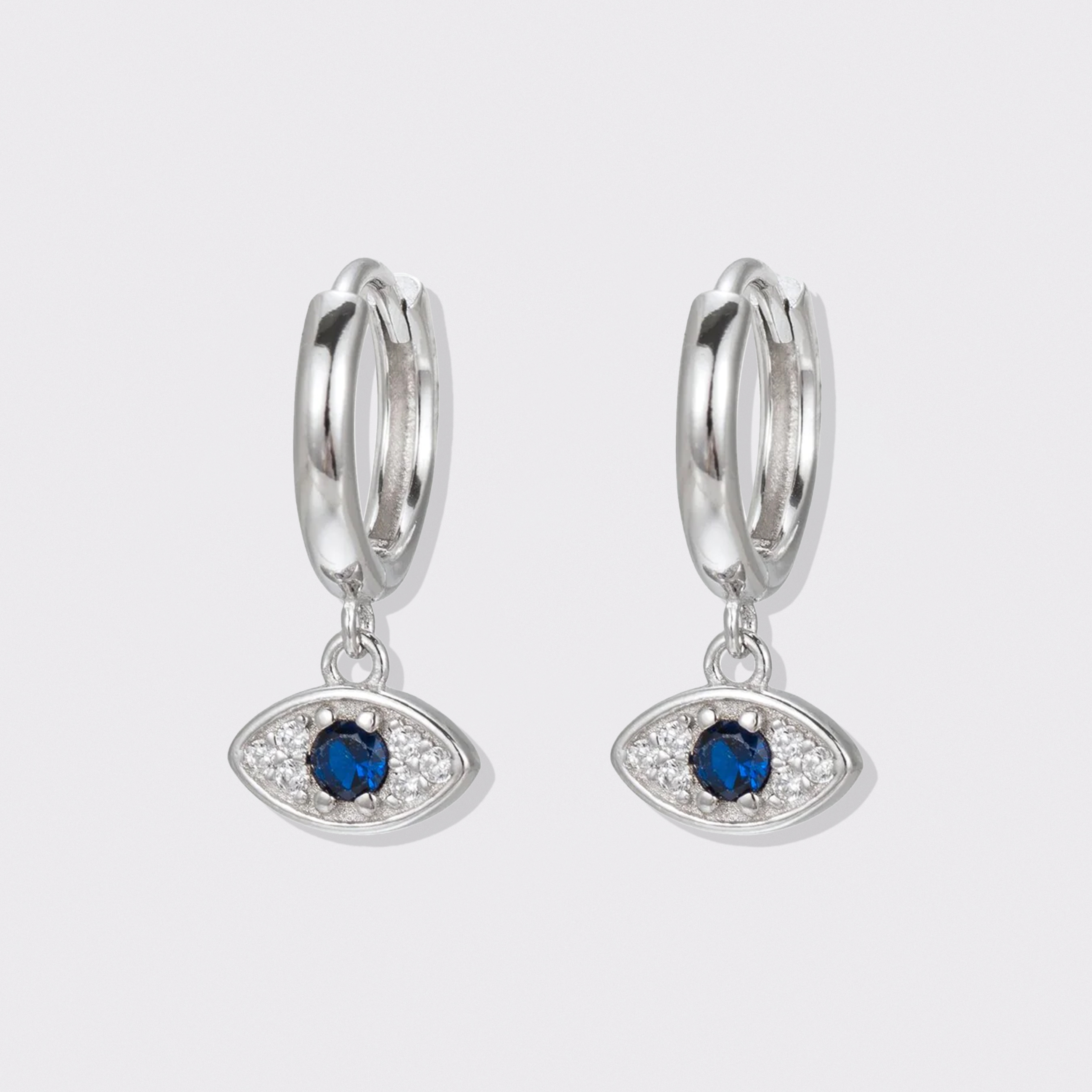 The evil eye holds so much meaning for so many across the world from different religions and cultures. The evil eye can be integrated into jewellery in a variety of different ways including these huggie earrings. Made from sterling silver the small hoops feature a little evil eye charm hanging from it delicately, creating an intricate piece of jewellery. When hanging on either side of your face, these evil eye charm earrings will protect you from harm and bring only good luck to your life. Huggie evil eye earrings are the perfect addition to any collection of evil eye jewellery. Silver evil eye earrings that have been made from 925 sterling silver, like this pair will last a lifetime if looked after well and can be found at e&e Jewellery London, UK.