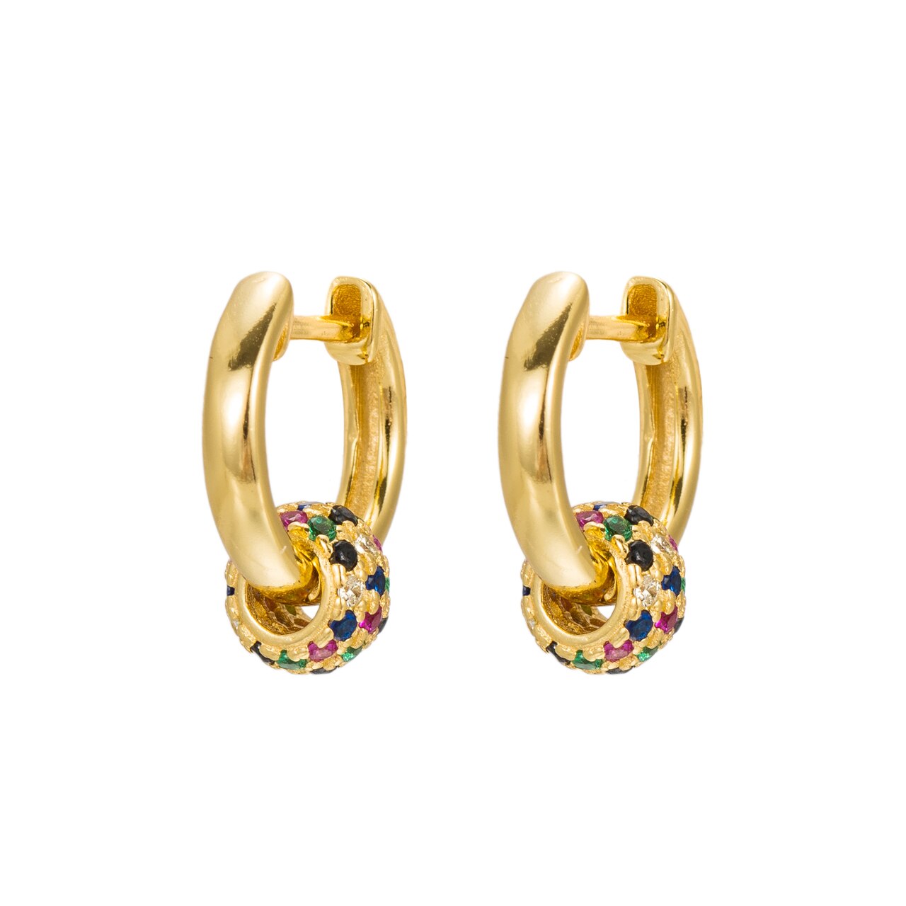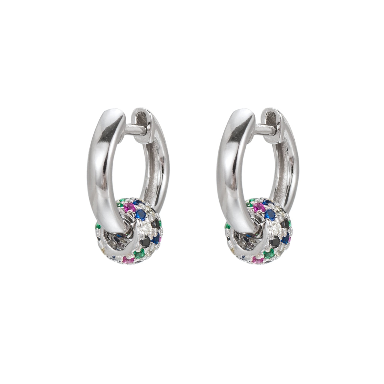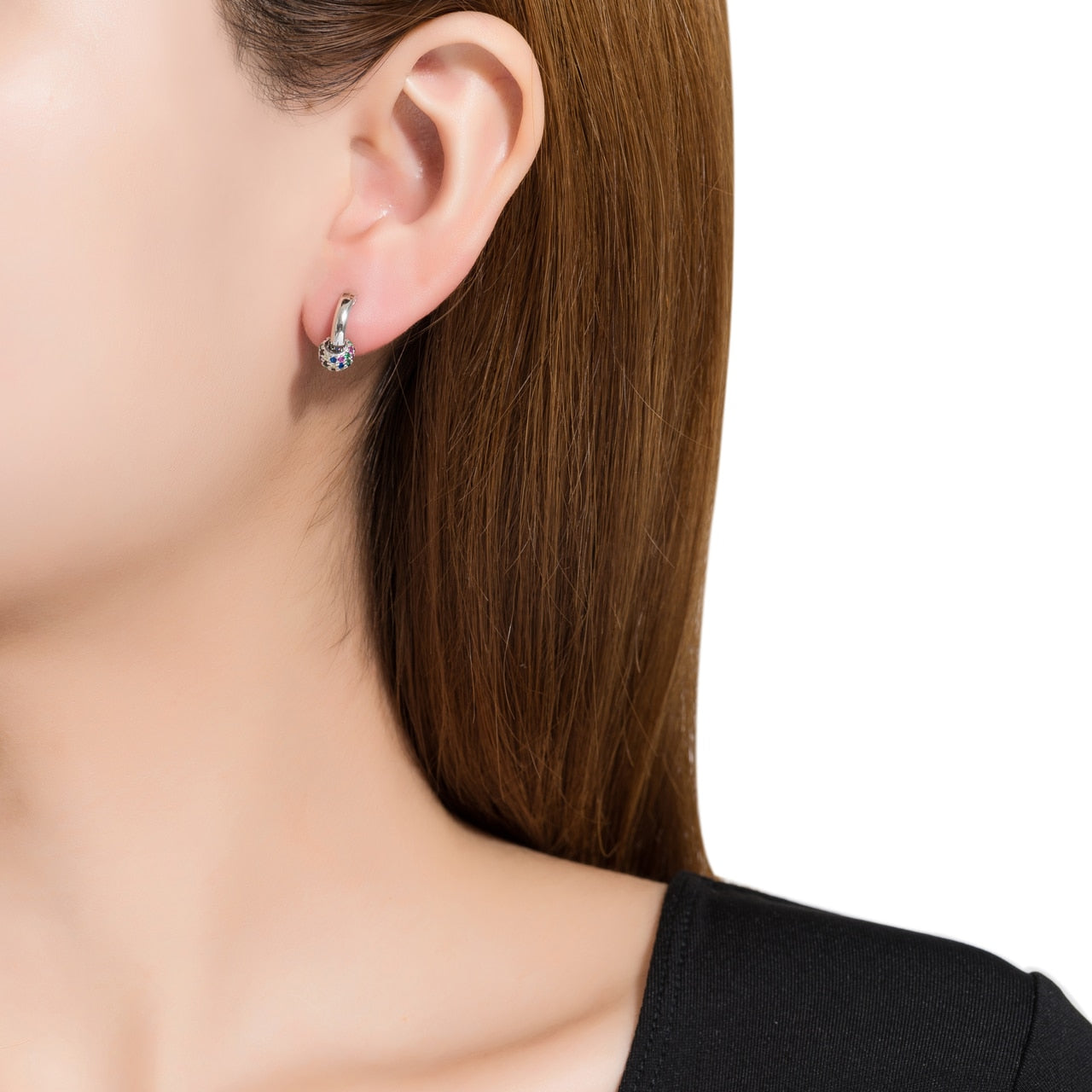 The design possibilities of dangly hoop earrings are endless. Whether you are looking for silver dangly hoops or silver hoop earrings e&e has just the right pair for you. Hoop earrings and huggies are slightly different in that hoops are larger while huggies will hug your ears snuggly. These silver huggie earrings have a thick hoop with a rainbow charm in the center, adding a splash of color to your look, allowing you to shine brightly like the pot of gold at the end of a rainbow. Sterling silver hoops are so versatile that you can wear them anywhere, anytime with any style of outfit. If you don’t have silver hoops or dangly earrings in your collection, add in a few today, like this pair from e&e.